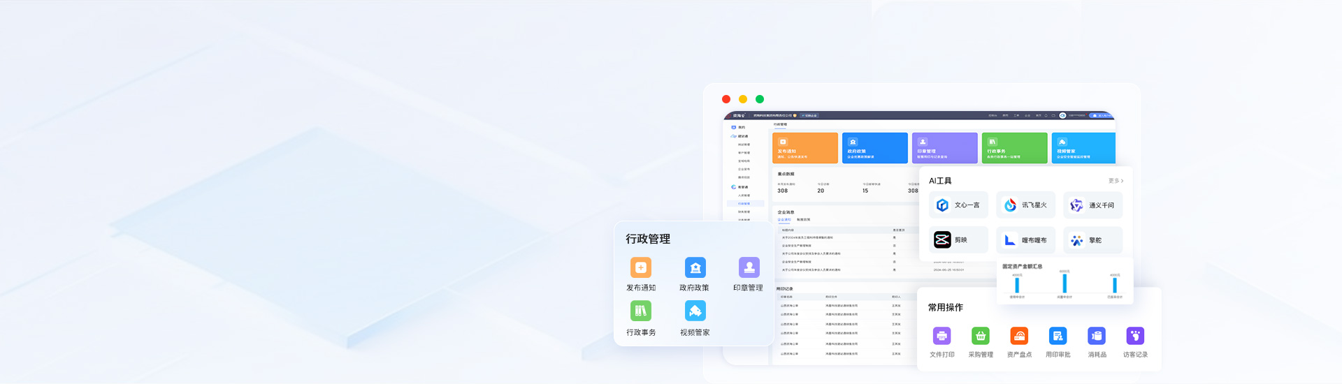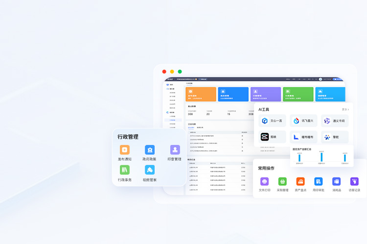 行政管理系統(tǒng)涵蓋信息發(fā)布、政策導航、行政事務、資產(chǎn)管理、運營分析等功能,同時推出智能印章、視頻管家等智能硬件,軟硬件結(jié)合,提升企業(yè)管理效率、為企業(yè)實現(xiàn)降本增效。